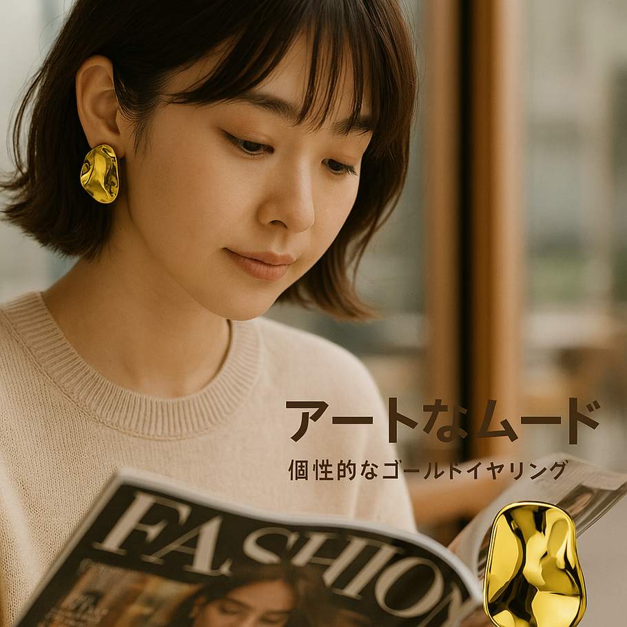 存在感のあるメタリックゴールドが耳元で輝く、モダンな不規則デザインイヤリング。